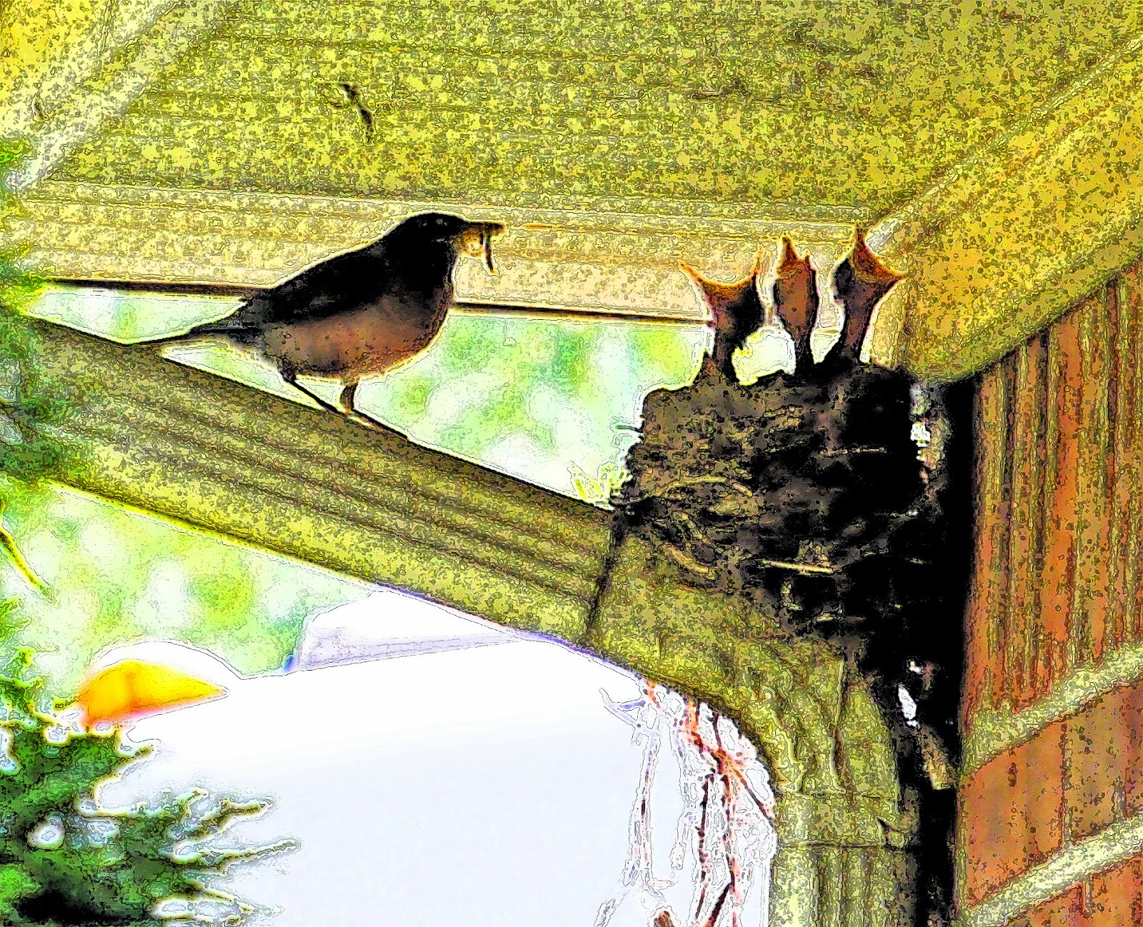 Here's one of the rescued baby robins...now old enough to have left the nest. I "borrowed" this photo from Kathy as I haven't been out and about in the last few days to take any pictures. I guess this fella and two of his siblings were entertainment for our grandchildren at various times yesterday. At that time there was only one left in the nest.