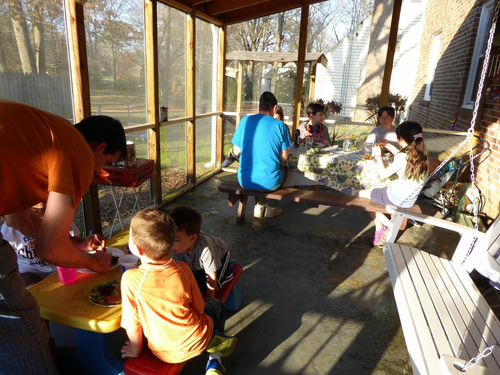 We had a nice treat this evening...got invited next door to "the neighbor's" (Nathan & Kathy and family)first Spring cookout. Food was yummy and the company was delightful! I had a full day of school this morning and the first part of the afternoon. This is the day that I have all six of my scholars and Elijah twice. Abigail got the sleeves set into the doll dress that she is making...big accomplishment! Elijah worked with snap circuits. He is getting pretty good at following the diagram and making sure that he has a closed circuit. Woody walked five miles today. His walk included a stop at the library to pick up a book that he had requested and to get a book that I needed next in a series. The book that he got for me was a huge over 500 page book...that taxed his upper body strength on the last part of his walk! Abigail came over almost as soon as Elijah finished his extra time with me. She wanted to put all the Bobbsey Twin books that we have in the order they should be read. That took a bit of time. I have some Bobbsey Twin books that were my mother's and some that were mine and some that were Melany's and some that used to be in the church library. We have been revamping the older children's books at the church library and the Bobbsey Twins just weren't being read/checked out any more so we decided to discard them...and since I have a love of those books from my childhood, I just couldn't totally get rid of them so they left the church library shelves and found a home in a bookshelf in the school room at our house. Abigaill and I are reading a Bobbsey Twin book out loud for her extra reading and she decided that she really liked them so she got her daddy to read one to the girls for their bedtime stories. And, they decided that they wanted to read them in order...so now they can go through ours (after Abigail's diligent work this afternoon) in the order that we have them. We have a few missing and Abigail plans to see if she can get them on her Kindle. So for the moment The Bobbsey Twins...old that may be...are being read by another generation in my family. It has been a beautiful day. Several of the children and I decided to do our reading time out on the front porch in the glider today...nice! Esther and Elijah helped Goosey (Woody) in one of our gardens today...you should have seen their hands when they got through. The children really enjoyed a pretty day to be out to play and garden.